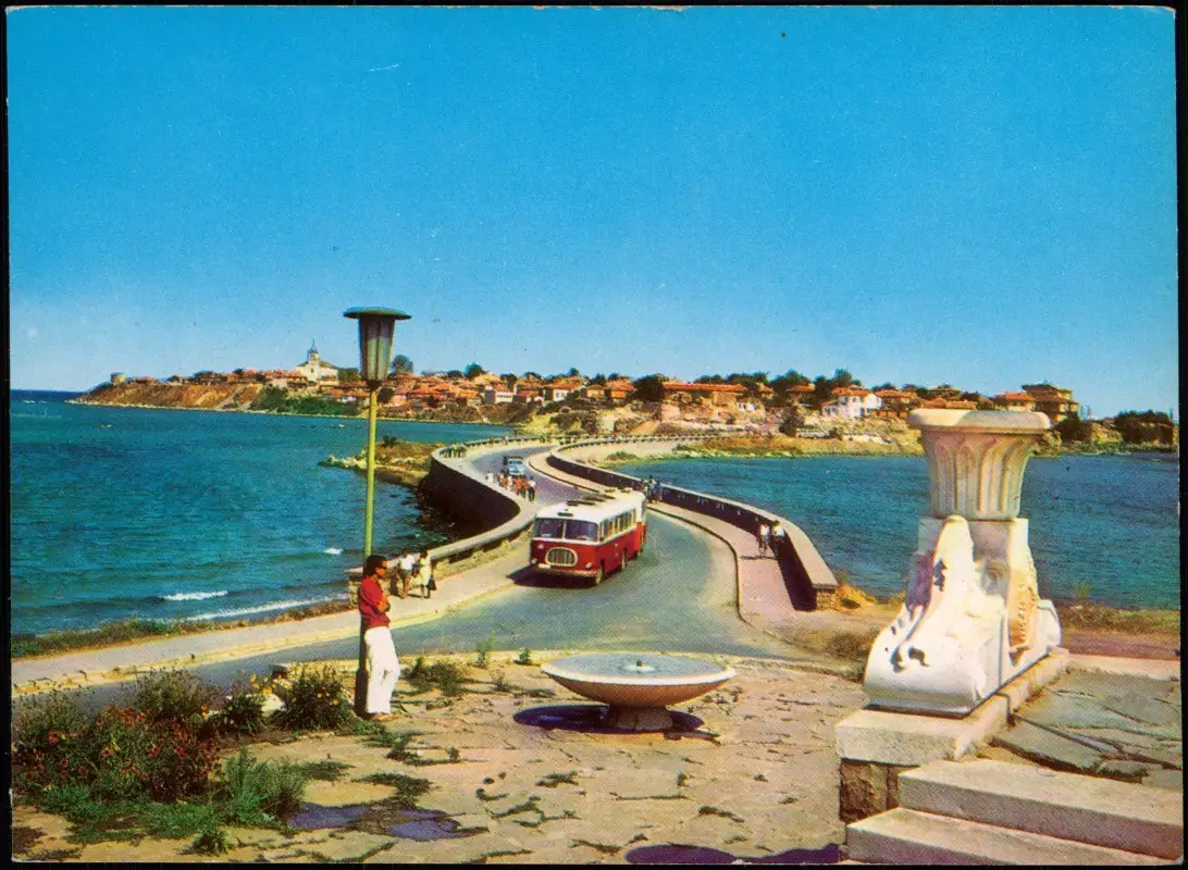 Postcard Nessebar Несебър Bus, Brücke und Stadt 1977