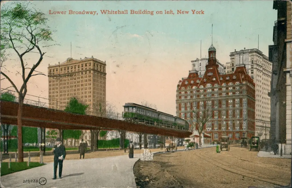 Postcard New York City Hochbahn, Lower Broadway Whitehall Building 1910
