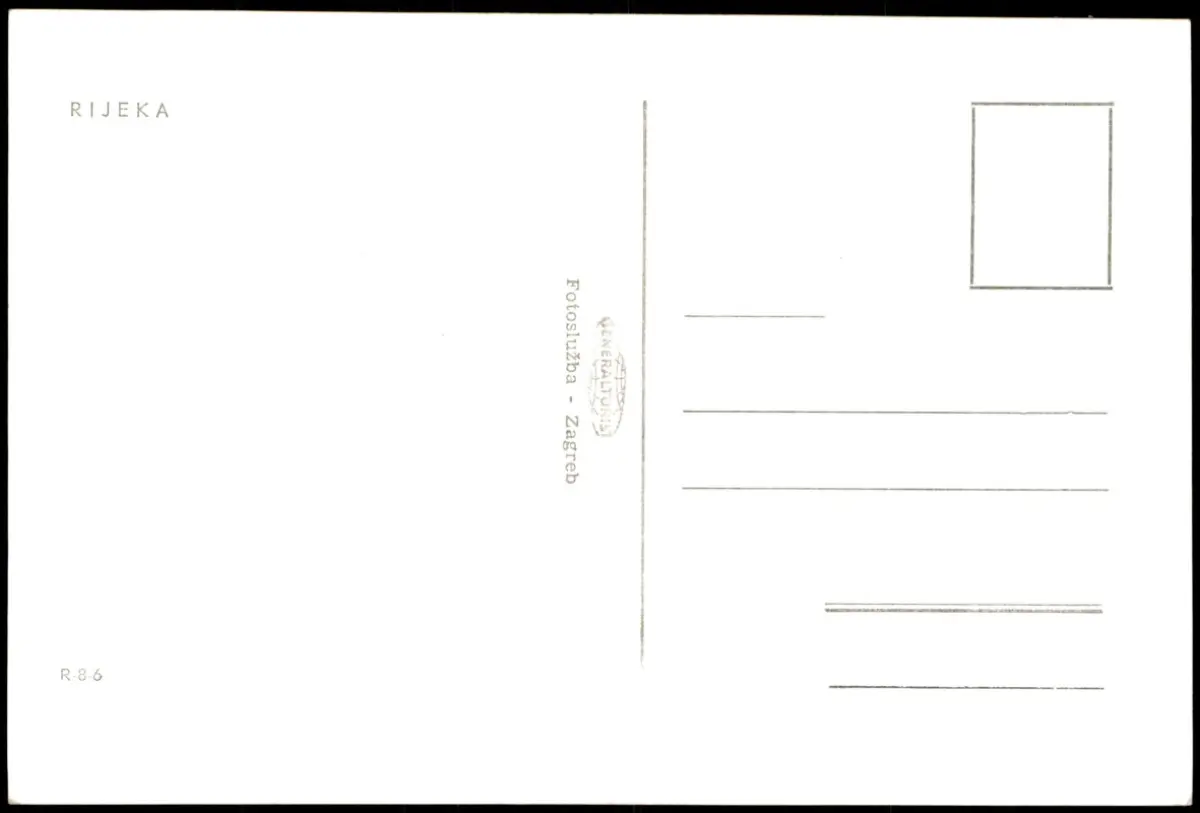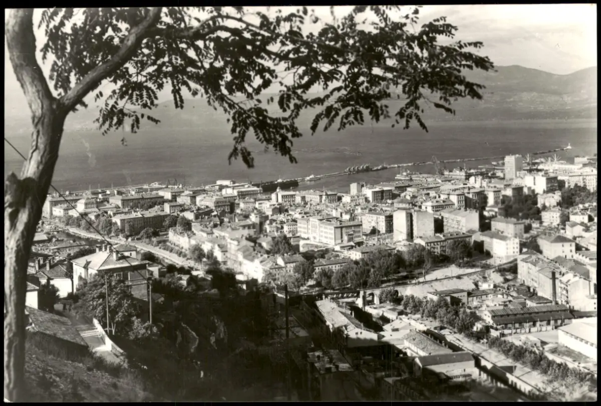 Infos: Schwarz-weiß Fotografie einer Panorama-Ansicht der Stadt Rijeka, aufgenommen von einem erhöhten Standpunkt. Die Abbildung zeigt die dichte städtische Bebauung im Vordergrund sowie die Hafenanlagen und das Meer im Hintergrund. Am oberen linken Bildrand rahmen Baumzweige die Szenerie ein. Die Karte wurde von Fotoslužba Zagreb für Generalturist produziert.