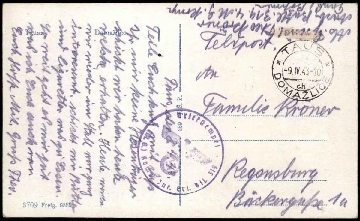 Postcard Taus Domažlice Markt 1943 gel. Feldpoststempel WK2 b Pilsen
