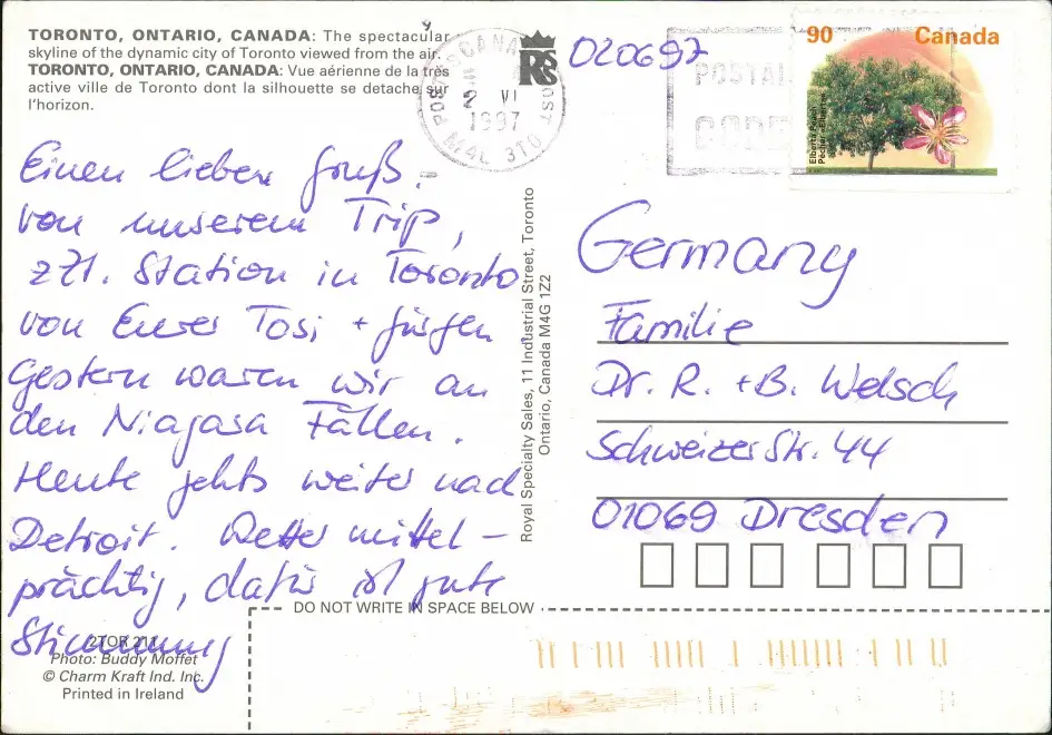 Postcard Toronto Totale Skyline CN Tower 1997