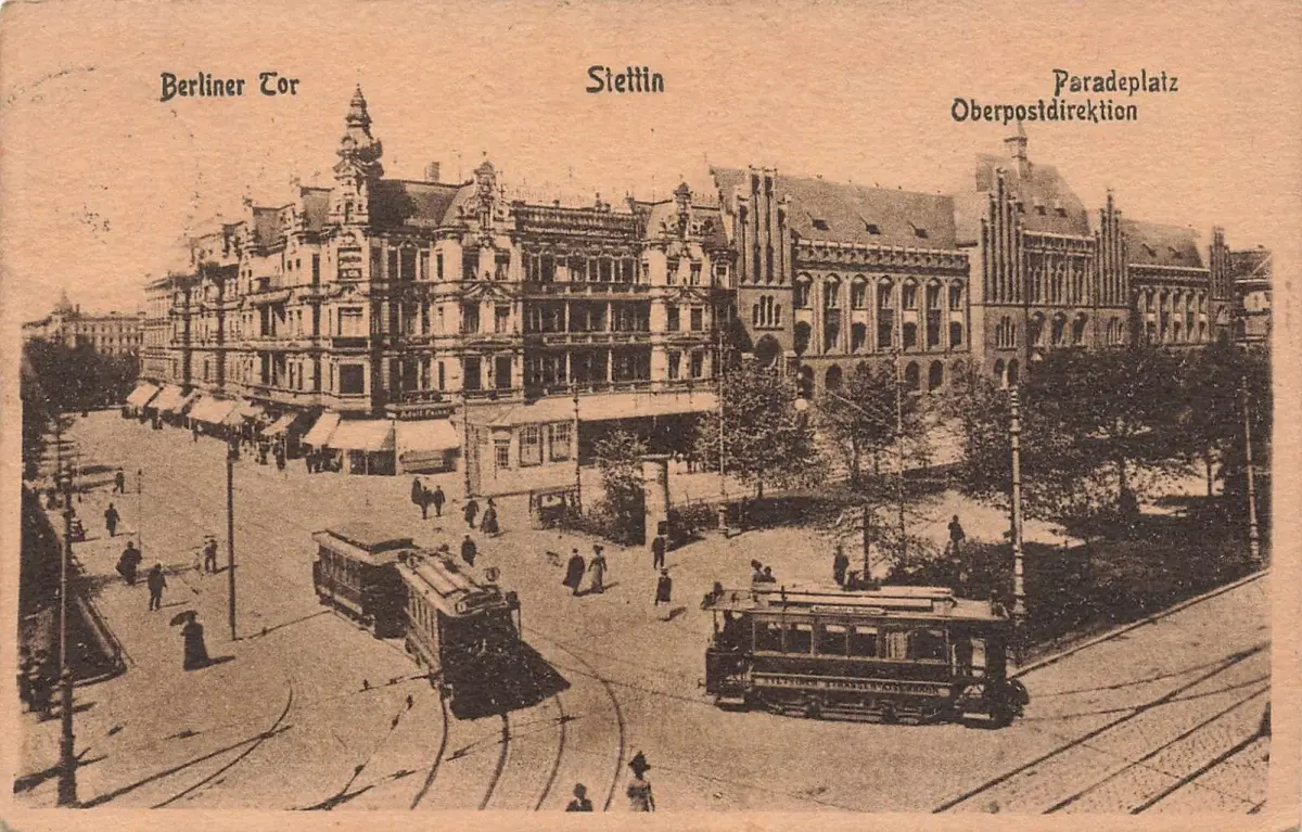Postdirektion , Paradeplatz und Berliner Tor Stettin Pommern Postkarte AK