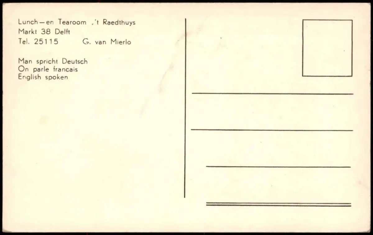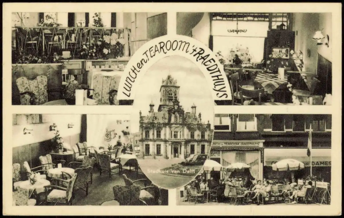 Postkaart Delft Delft Lunch-en Tearoom .'t Raedthuys Markt 1935