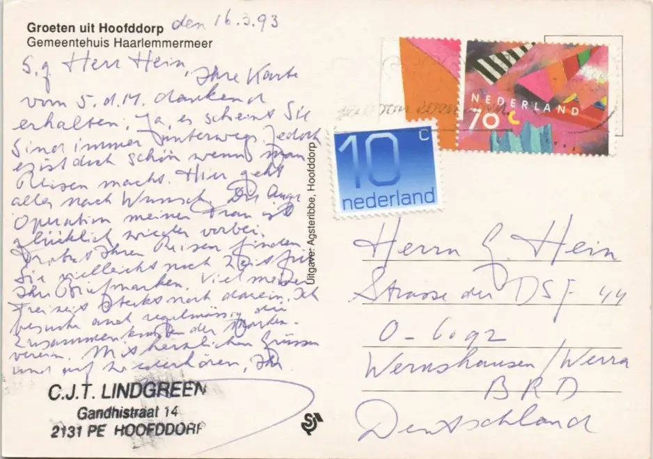 Postkaart Hoofddorp Gemeentehuis Haarlemmermeer Ortsansicht 1993