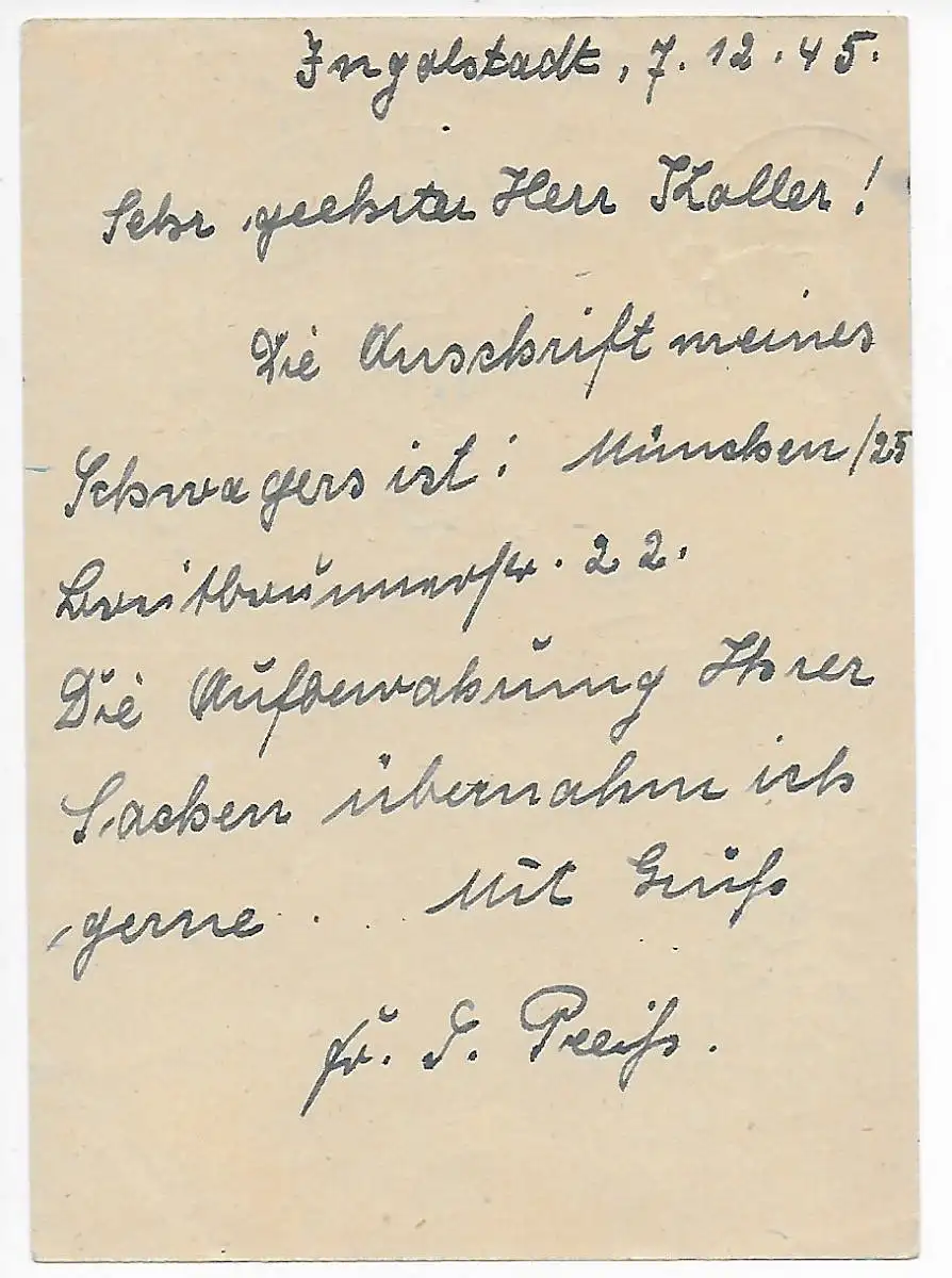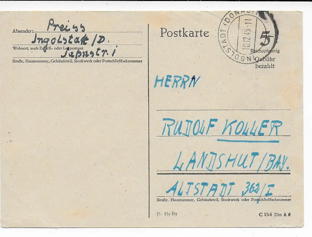 Postkarte 5 RPfg, Gebühr bezahlt Ingolstadt nach Landshut 1945