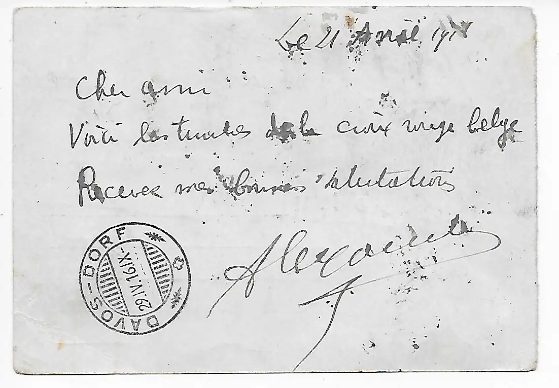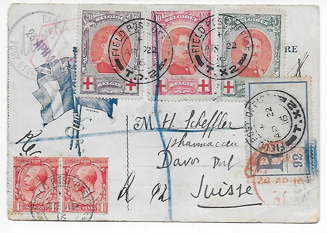Postkarte Belgien: Britisches Field Post Office, Einschreiben nach Davos, 1916