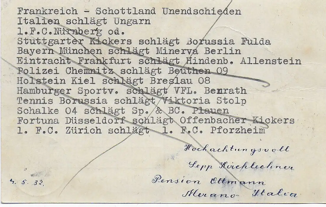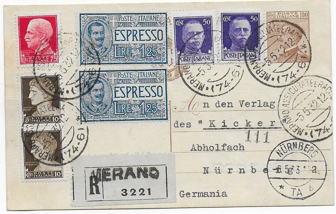 Postkarte Einschreiben Merano an Kicker-Nürnberg 1932 mit Fussballergebnissen