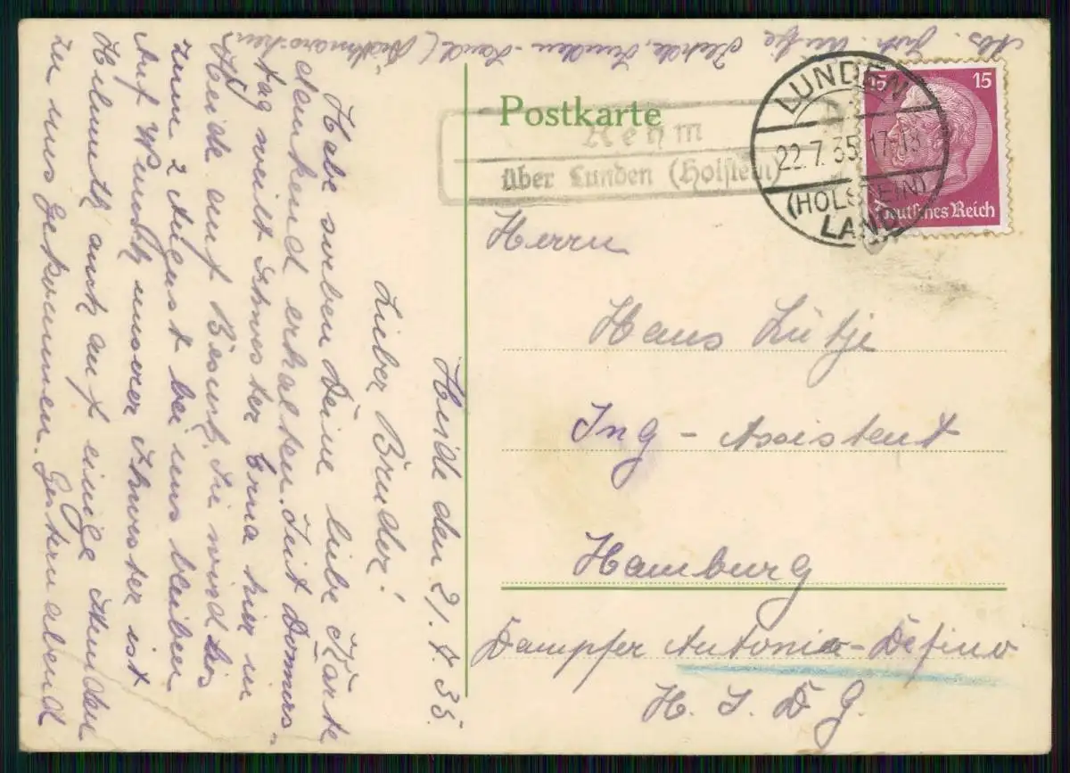 Postkarte Landpoststempel Rehm über Luden b. Heide St Peter-Ording 1935 gelaufen