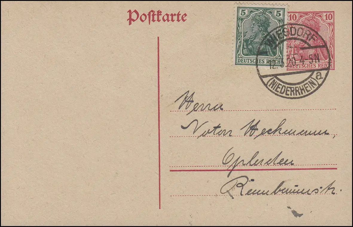 Postkarte P 107I mit Zusatzfr. von WIESDORF (NIEDERRHEIN) a 12.3.20 nach Opladen