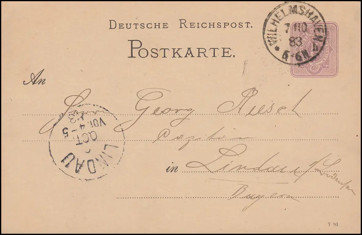 Postkarte P 12/01 Ziffer 5 Pfennig DV 7 83 WILHELMSHAVEN 7.10.1883 n.LINDAU 8.10