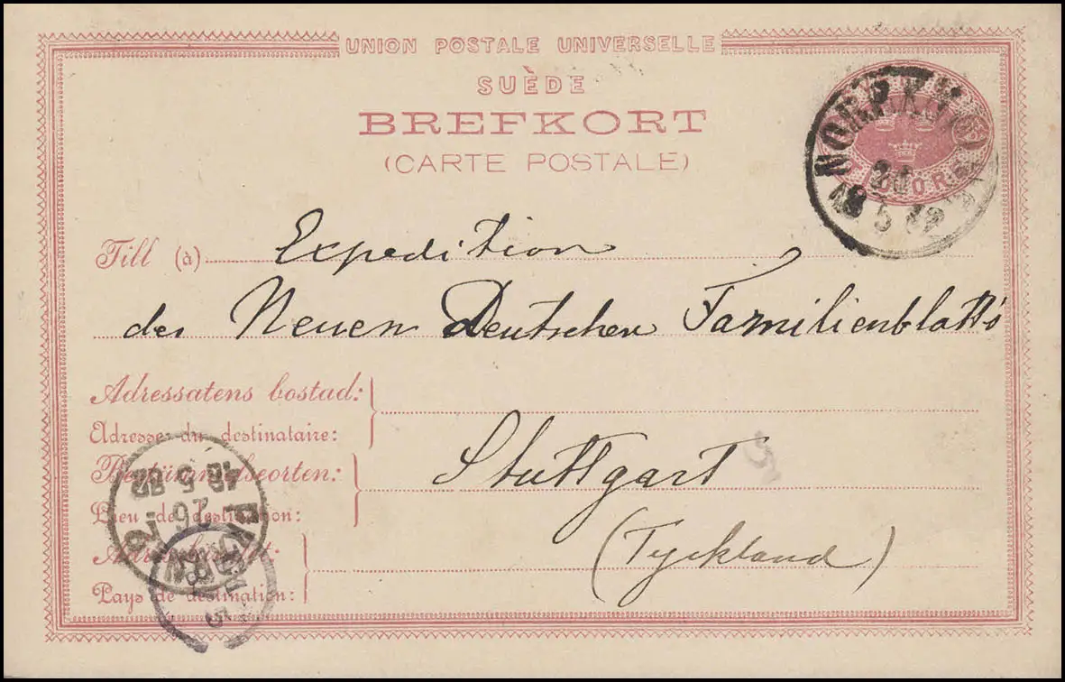 aus NORRKÖPING 26.5.82 als Auslandspostkarte an die "Neuen Deutschen Familienblätter" in Stuttgart / Ankunftsstempel "D1 28/5"