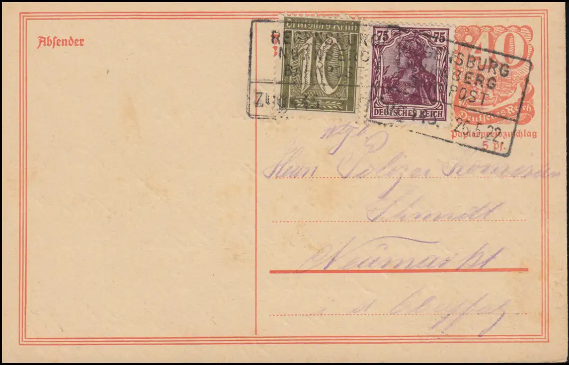 Postkarte P 141I mit ZF per Bahpost REGENSBURG-NÜRNBERG ZUG 445 - 26.5.1922