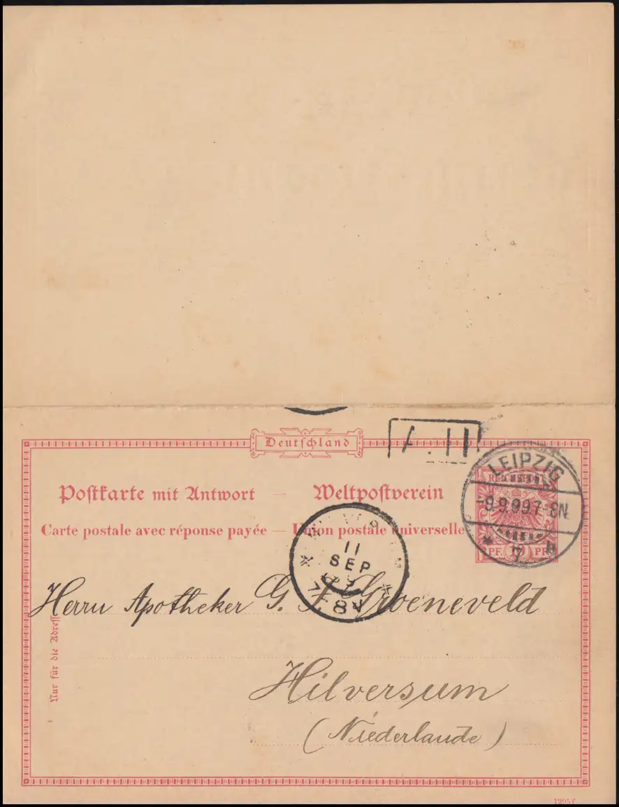 Druckvermerk: 1295f, Auslands-Doppelkarte nach Holland: Werbekarte an Apotheker für Kräuterwein der Firma Huber Ullrich in Leipzig