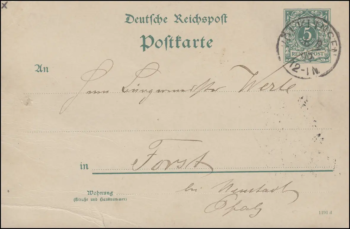 Postkarte P 30I Ziffer 5 Pf. DV 1191 d, VÖLKLINGEN 6.2.1892 nach Forst/Neustadt