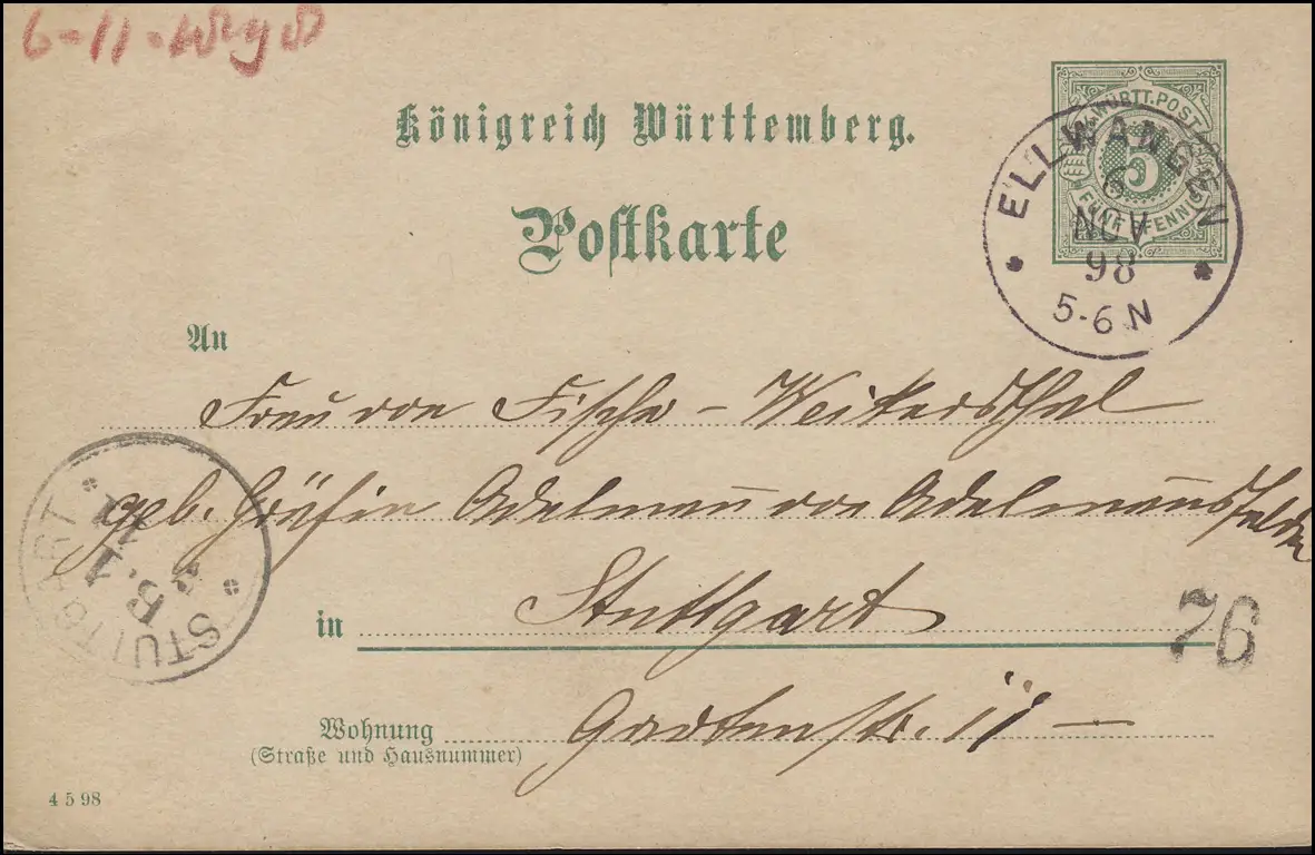 Postkarte P 37 Ziffer mit DV 4 5 98, ELLWANGEN 6.11.1898 nach STUTTGART 7.11.