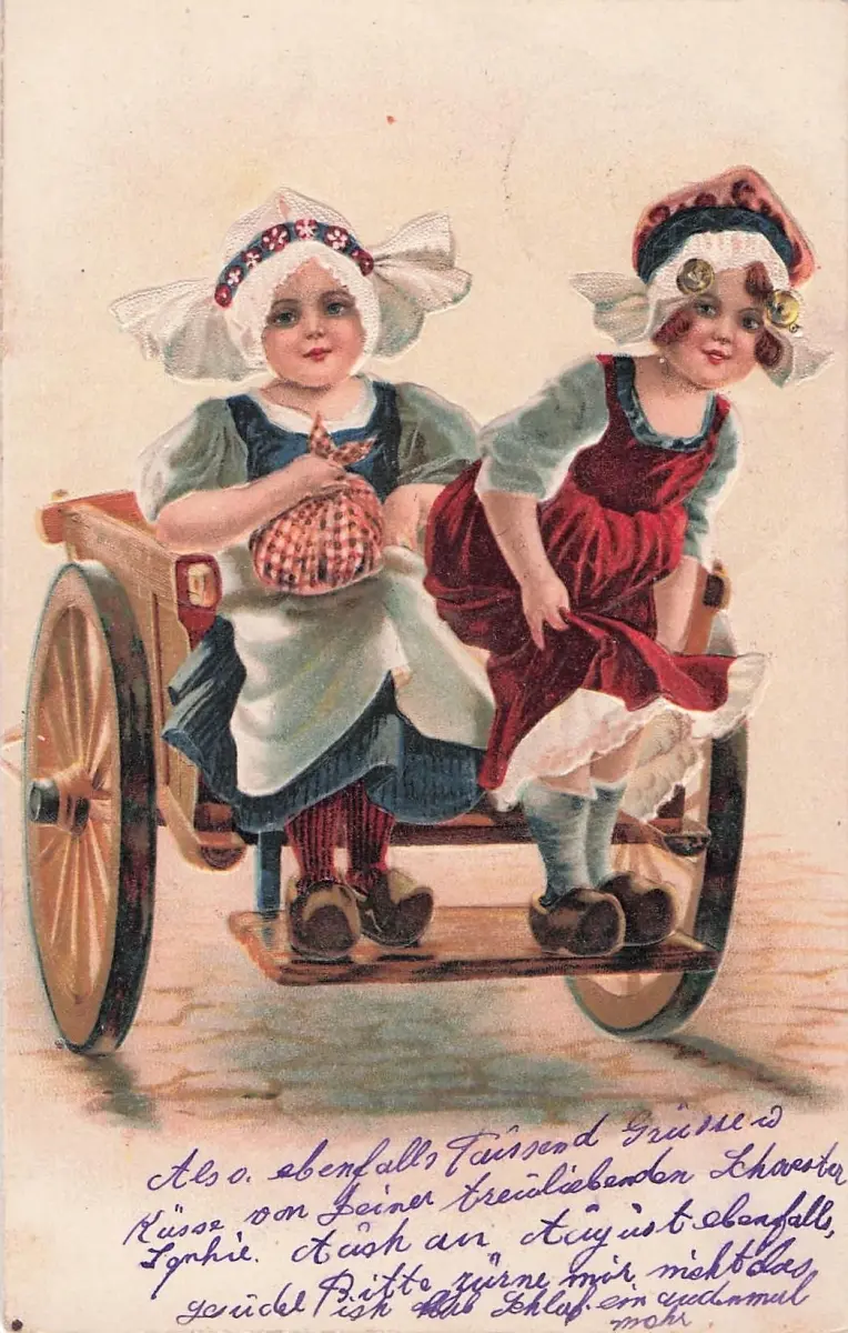 Postkarte P115 mit geprägtem Motiv: Holländische Mädchen im Karren, Happy Returns Clogs, 1908 -798620