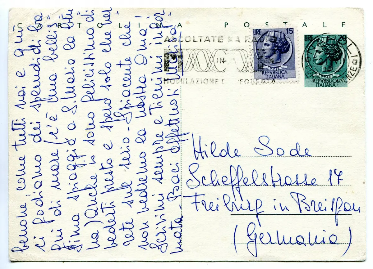 - C.P. Lire 20 Syracusana (Filagrano n. C 154) gereist nach Deutschland mit Mehrwert Lire 15 - sehr guter Erhaltungszustand - Nr. 119/WEB