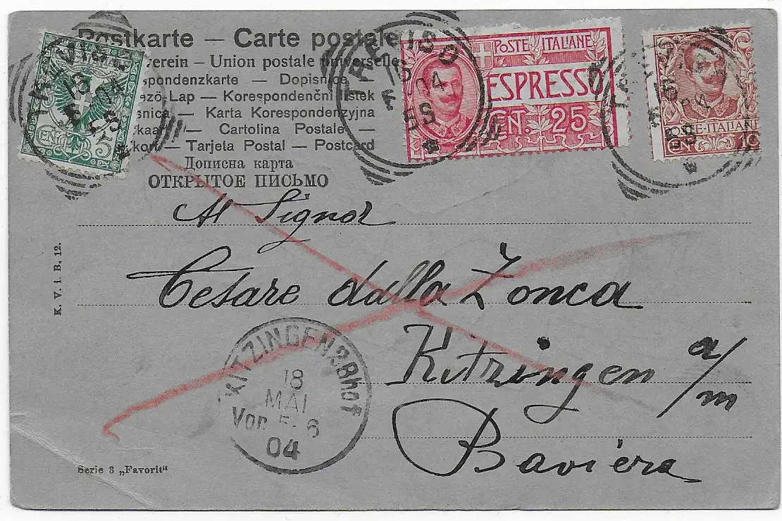 Postkarte Treviso 1904: EXPRESS nach Kitzingen