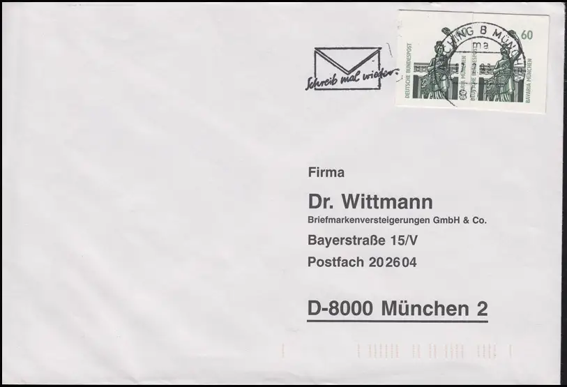 Postkartenausschnitte 2x 60 Pf. Bavaria als MeF auf Brief GARCHING 17.2.93