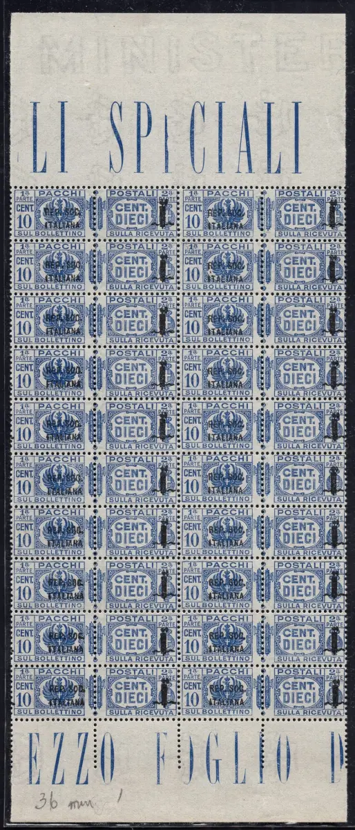 MNH - Vollgummi - Postpakete Cent. 10 Band Nr. 37 Block mit zwanzig Exemplaren Blattrand, erste Reihe mit mm Aufdruck. 36, die zweite von mm. 39 (Nr.37 + 37a) - Im Block befindet sich der Tippfehler Position 73 Nr. 37b Komma statt Punkt nach Rep - Kat. euro 3600 Cod. 3061/WEB