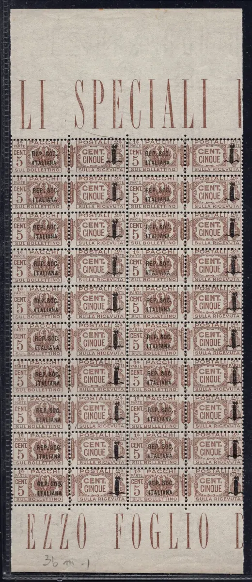 MNH - Vollgummi - Postpakete Cent. 5 Band Nr. 36 Block mit zwanzig Exemplaren Blattrand, erste Reihe mit mm Aufdruck. 36, die zweite von mm. 39 (Nr. 36 + 36a) - Im Block befindet sich der Tippfehler Position 73 Nr. 36b Komma statt Punkt nach Rep. - Kat. euro 3600 Cod. 3062/WEB