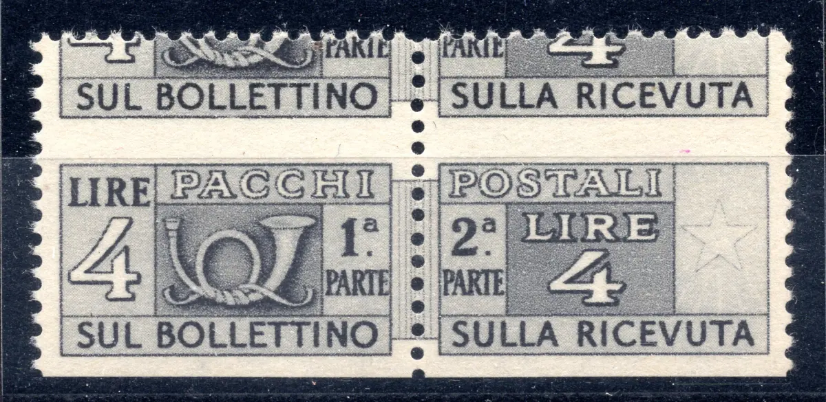 Vollgummi - Postpakete Lire 4 Nr. 71 unten ungezähnt mit stark nach oben verschobener horizontaler Zahnung oben, so dass auch oben der Schriftzug Auf Bulletin - Auf Quittung - Unveröffentlichte Nr. 712/L