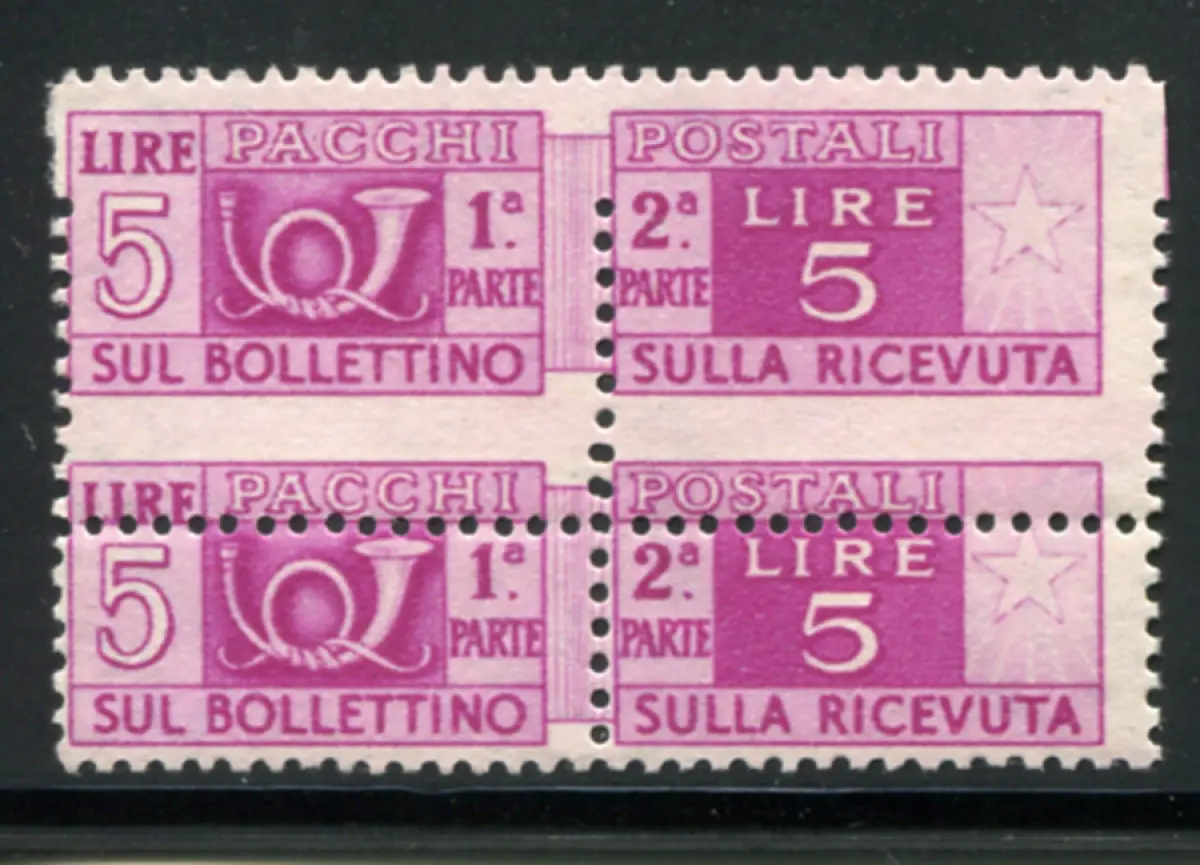 Postpakete Lire 5 Sorten starke Verschiebung des Bohrkammes Vollgummi - Postpakete Lire 5 Nr. 72 vertikales Paar mit starker Verschiebung des Bohrkammes - oberes Exemplar mit der Aufschrift Postpakete wiederholt unten - Unveröffentlichter Code 758/8