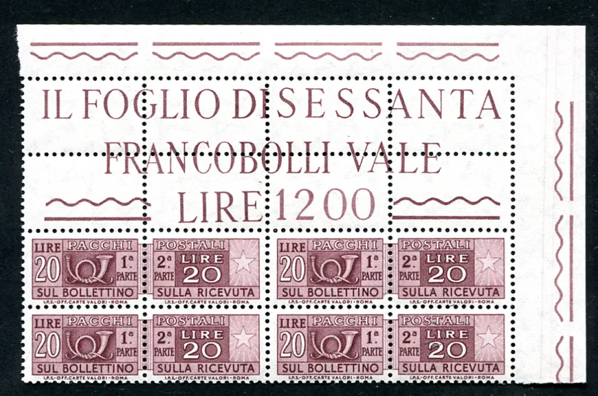 Postpakete l. 20 IPZS Sterne IV Block mit perforiertem Winkel Vollgummi - MNH - Postpakete l. 20 IPZS Sterne IV Gummi Arabica, Viererblock mit Lochblechwinkel, sinusverziert (Sass. spec. Nr. BA 87, Griffe Nr. 166) - perfekter Vollgummi Katalog 6 Cod.1223/WEB