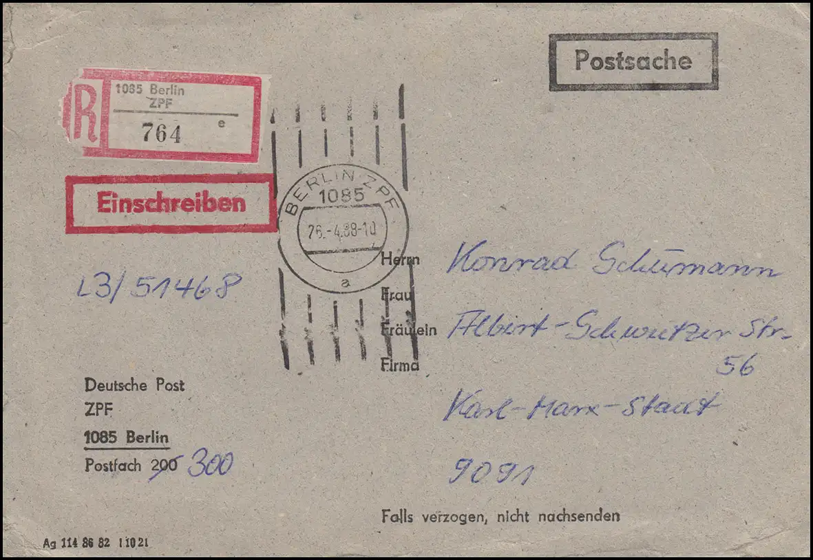 Postsache Deutsche Post ZPF Brief als Einschreiben 1085 BERLIN ZPF 26.4.1988
