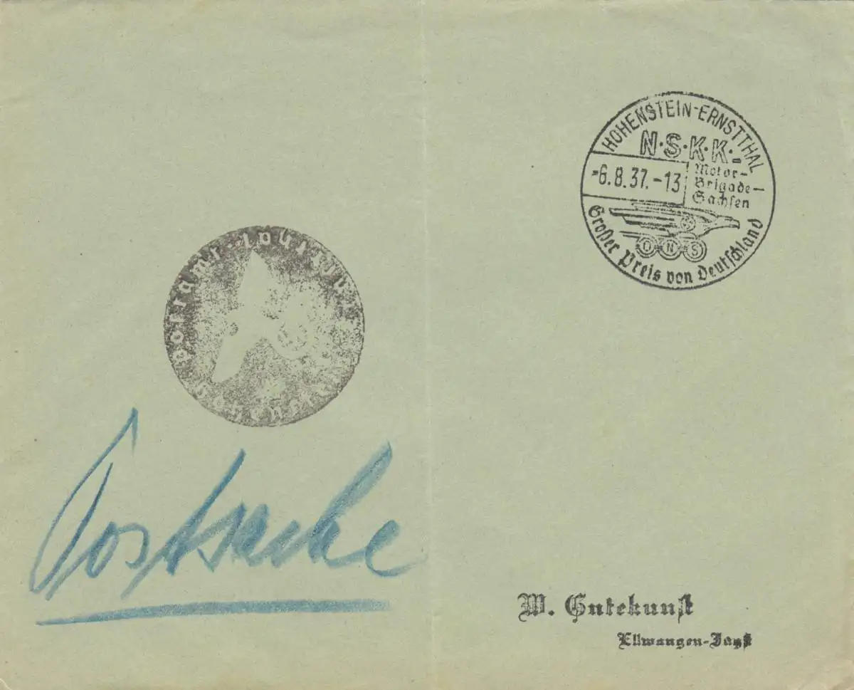 Postsache Kuvert 1937: Hohenstein-Ernstthal: Großer Preis von Deutschland NSKK Motor Brigade Sachsen