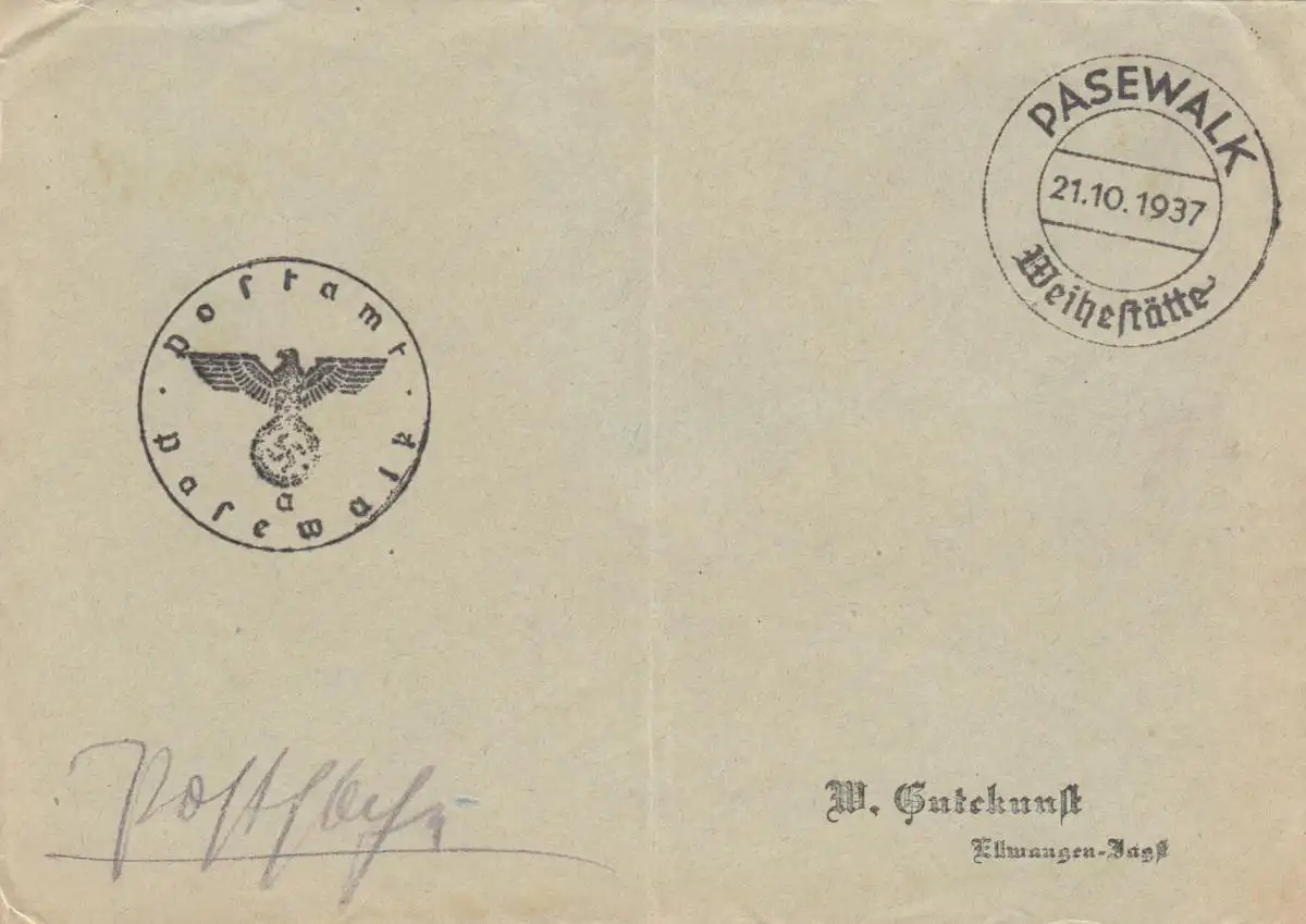 Postsache Kuvert 1937: Pasewalk Weihestätte