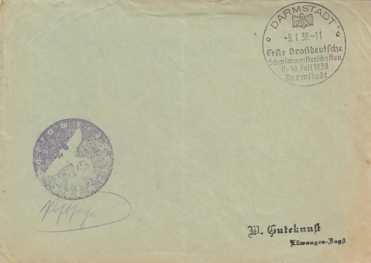 Postsache Kuvert 1938: Darmstadt: 1. Großdeutsche Schwimmmeisterschaften