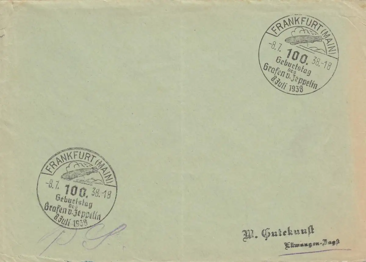Postsache Kuvert 1938: Frankfurt/Main: Geburtstag des Grafen von Zeppelin