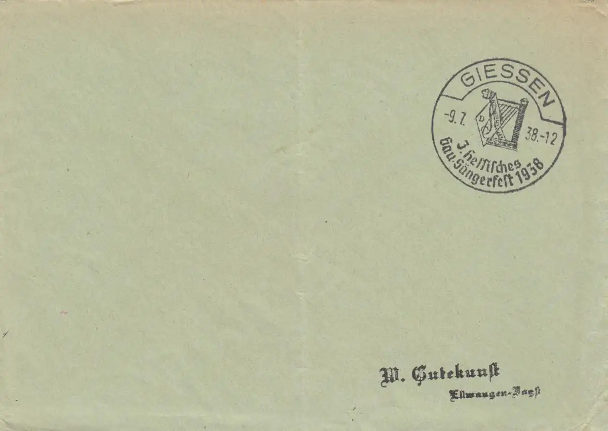 Postsache Kuvert 1938: Giessen 3. Hessisches Gau-Sängerfest, Harfe