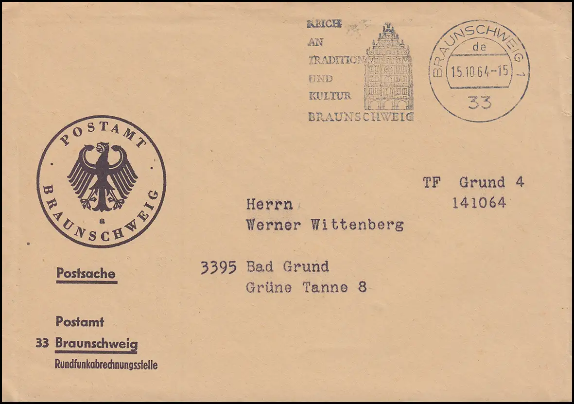 Postsache Postamt Braunschweig Rundfunkabrechnungsstelle 15.10.64 nach Bad Grund