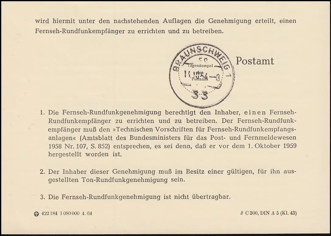 mit Genehmigungskarte "Fernseh-Rundfunkgenehmigung / Herrn ... wird hiermit unter den nachstehenden Auflagen die Genehmigung erteilt, einen Fernseh-Rundfunkempfänger zu errichen und zu beteiben. ..." mit Tagesstempel BRAUNSCHWEIG 14.10.54.