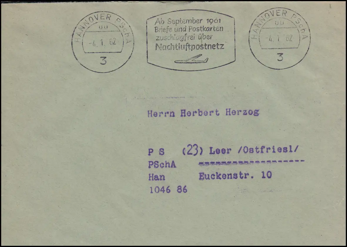 Postscheckamt-Stempel HANNOVER 4.1.62 zuschlagfrei Nachtluftpostnetz auf Brief