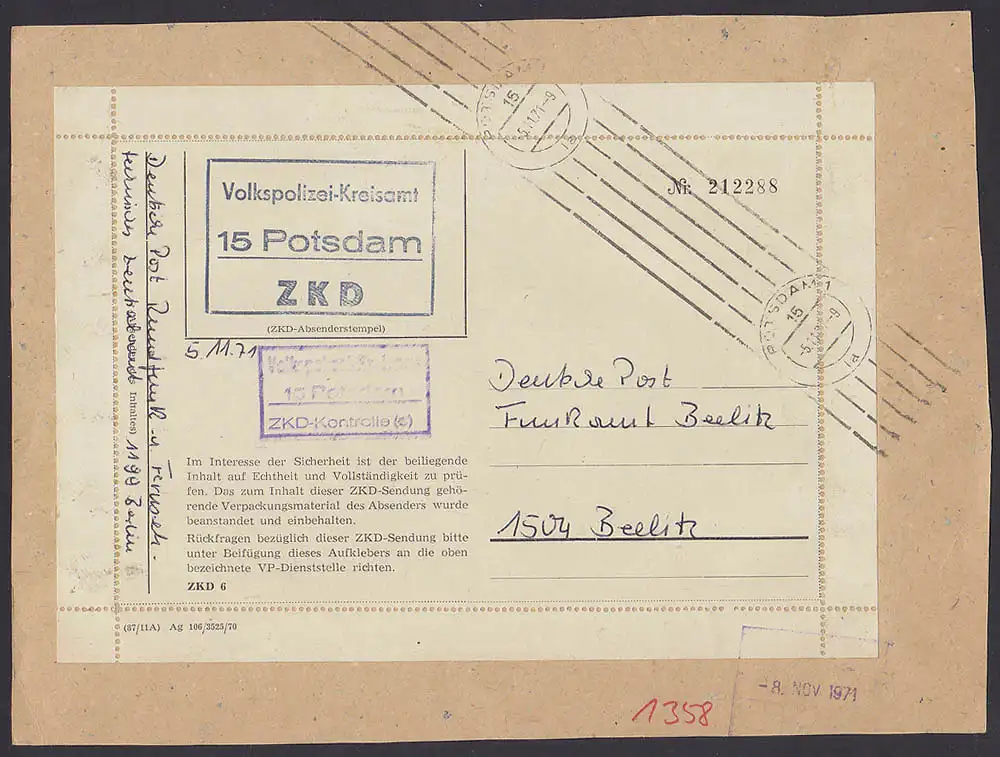 Potsdam Volkspolizei-Kreisamt, num. Aufkleber 212288 in hellrg?n mit R3 ZKD-Kontrolle, Prachterhaltung