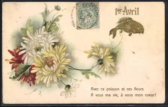 Präge-AK 1. April, Bunte Chrysanthemen mit Fisch