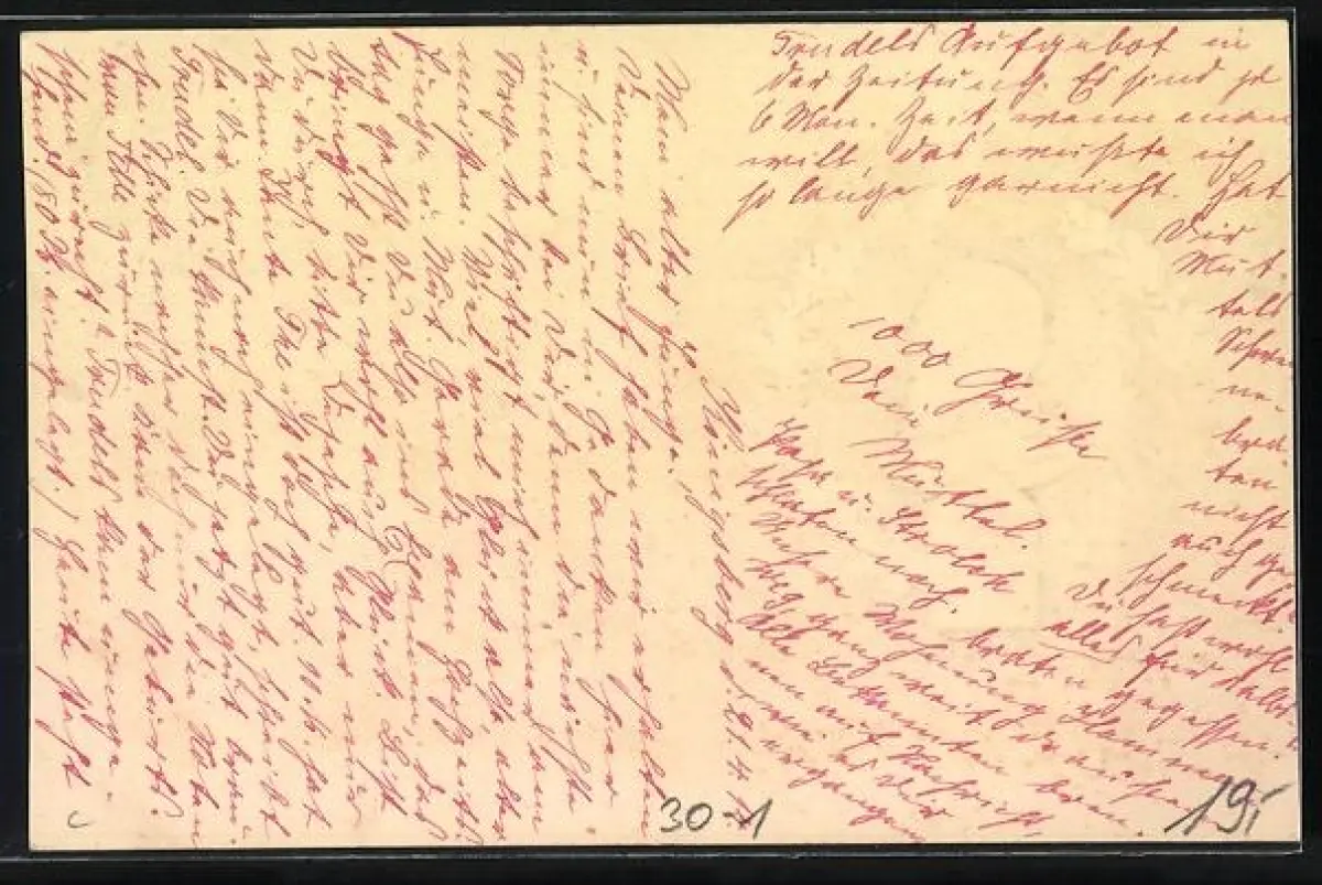 Personenbezogene Daten auf der Rückseite der Karte wurden durch blauen Textmarker unkenntlich gemacht. Die blauen Stellen sind auf die Vorderseite durchgeweicht und wirken sich negativ auf das Postkartenfoto aus