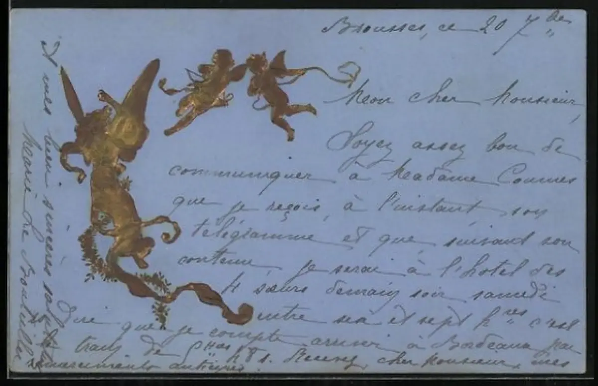 Präge-AK Amor zielt mit einem Pfeil auf eine Elfe