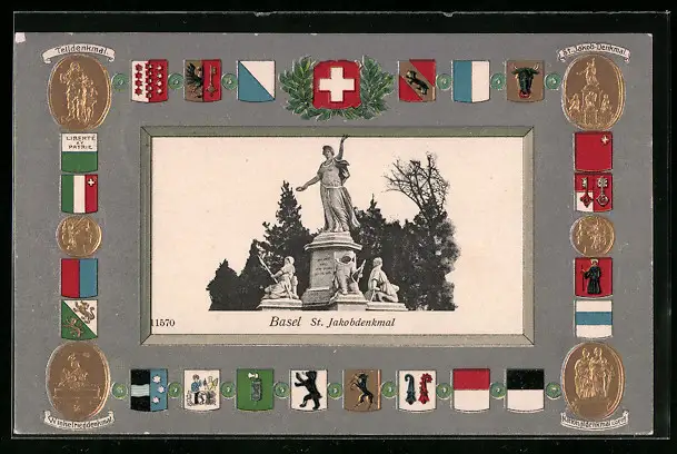 Präge-AK Basel, St. Jakobsdenkmal, Denkmäler und Wappen