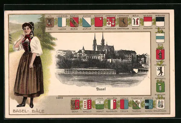 Präge-AK Basel, Uferpartie mit Kirche, Frau in Tracht, Wappen von Uri, Luzern und Bern, Passepartout