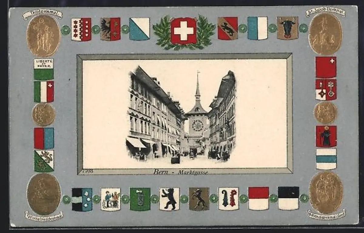Präge-AK Bern, Marktgasse im Passepartout-Rahmen, Wappen der Kantone