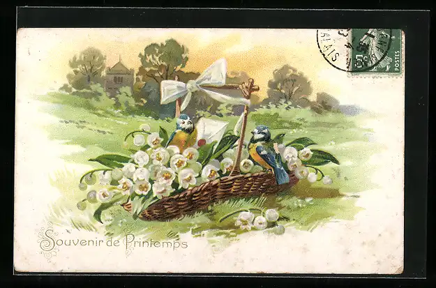 Präge-AK Blaumeisen und Blumen, Maiglöckchen