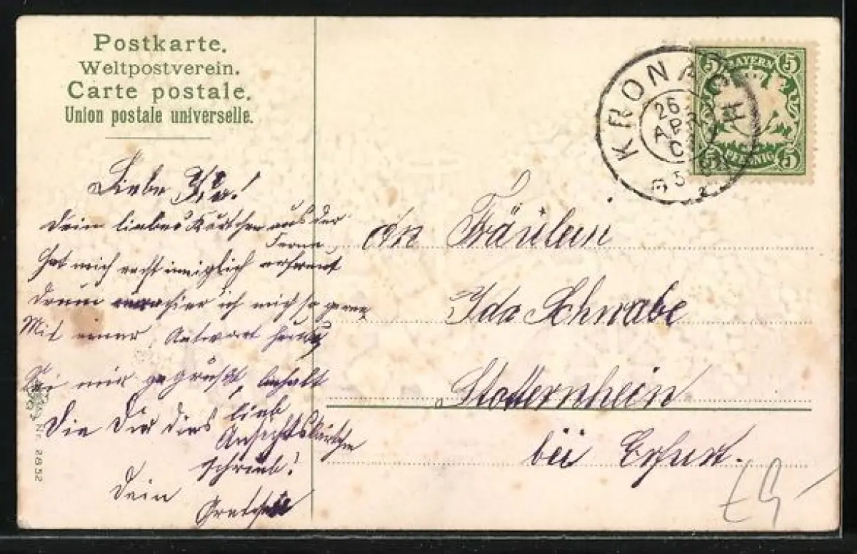 Personenbezogene Daten auf der Rückseite der Karte wurden durch blauen Textmarker unkenntlich gemacht. Die blauen Stellen sind auf die Vorderseite durchgeweicht und wirken sich negativ auf das Postkartenfoto aus