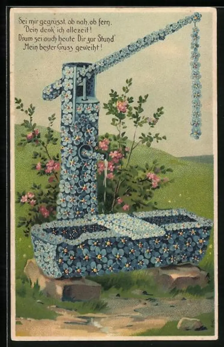 Präge-AK Blumenbild, Wasserpumpe aus Vergissmeinnicht mit Gedicht