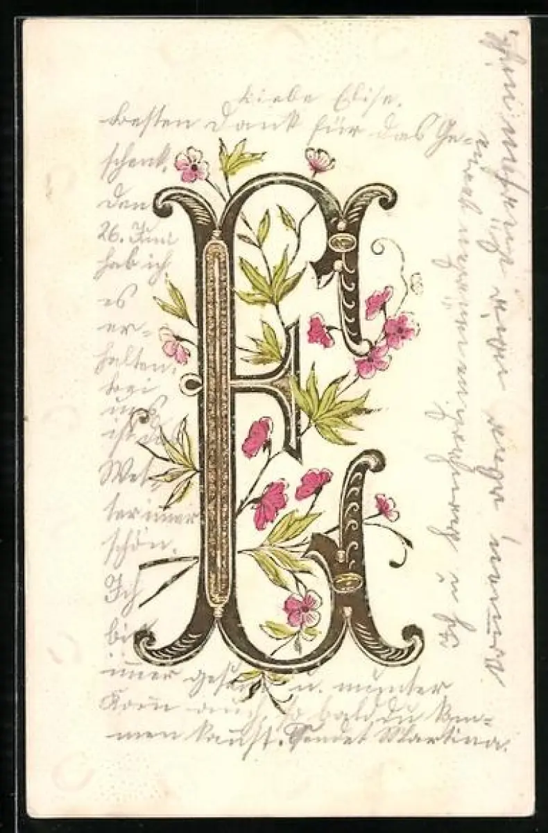 Präge-AK Buchstabe E mit rosafarbenen Blumen