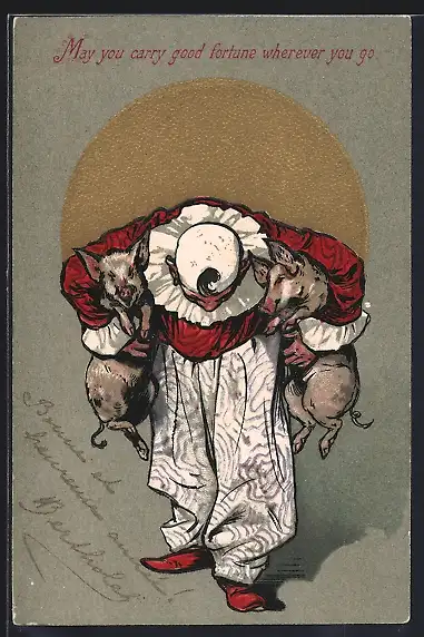 Präge-AK Clown trägt zwei Schweine unter den Armen