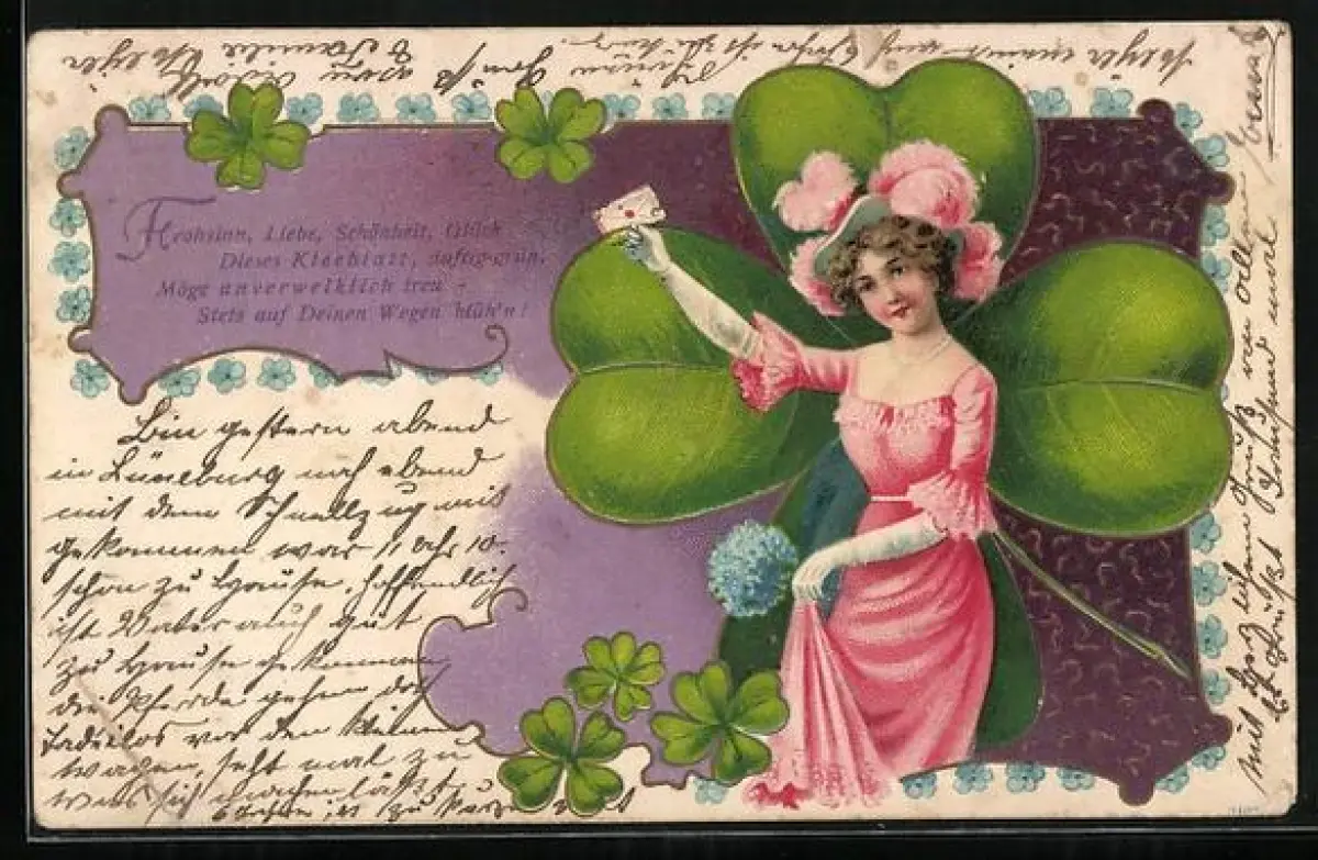 Präge-AK Dame mit Brief vor einem riesigen Kleeblatt